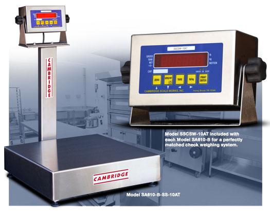 Cambridge Scale Works, Inc. Model SA610-B-SS-10AT Series bench scales feature high strength cast aluminum construction, heavy stainless steel column and cover, and IP 65 water seal rated aluminum load cell and includes the Model SSCSW-10AT Check Weighing Indicator for accuracy and reliability.
