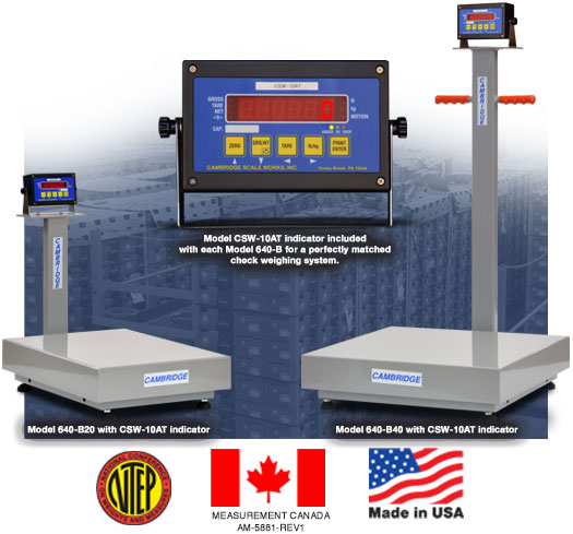 Cambridge Scale Works, Inc. Model 640-B-10AT Series single point bench scales feature tubular steel construction, heavy painted steel cover, and IP 65 water seal rated aluminum load cell and includes the Model CSW-10AT Check Weighing Indicator for accuracy and reliability.