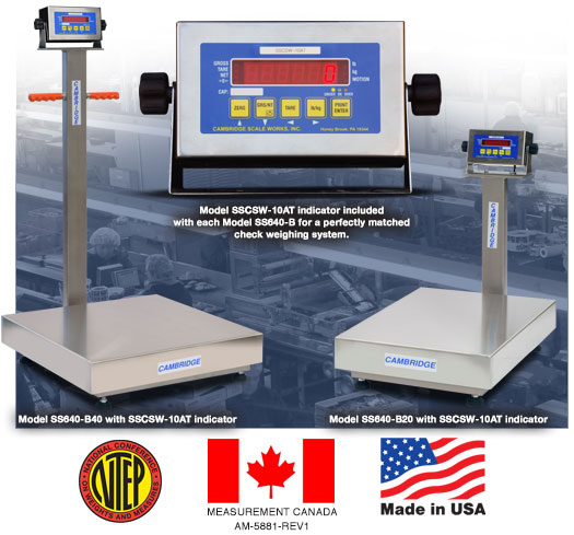 Cambridge Scale Works, Inc. Model SS640-B-SS10AT Series single point bench scales feature tubular stainless steel construction, heavy stainless steel cover, and IP 65 water seal rated aluminum load cell and includes the Model SSCSW-10AT Check Weighing Indicator for accuracy and reliability.