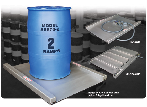 • Structural tubular stainless steel construction. • Heavy stainless steel plate deck. • 100% End loading capacity. • 150% Overload protection. • 20 Foot indicator cable. • Eye bolt holes allow easy set-up. • Shielded load cell and indicator cables. • Ultra-low profile (1.5” above the floor). • Live side rails to weigh oversized loads. • 1 Part in 5000 accuracy. • Live built-in easy incline ramp. • Shock load protection. • (4) Internally mounted, Environmentally protected, NTEP certified-5000 Division, Class III/IIIL, IP 67 water resistant rated stainless steel shear beam load cells. • Easy access leveling. • Remote stainless steel NEMA 4X junction box |