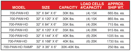 | MODEL 700-PAW-HD STANDARD FEATURES • “Heavy Duty” Concentrated Loading • 60K, 70K, and 80K Lb. Total Capacity • 15K & 20K “Heavy Duty” Environmentally Sealed Load Cells • Polycarbonate NEMA 4X Junction Box • 4” Structural Tubular Steel Construction • Diamond Tread Deck Plate • 200% Overload Protection OPTIONS ACCESSORIES • Note: Optional ramps are constructed with |