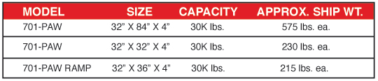 | MODEL 701-PAW STANDARD FEATURES • 60K Lb.Total Capacity • Four 10K Lb. Environmentally Sealed Load Cells (Per Scale) • Polycarbonate NEMA 4X Junction Box • 3” Structural Tubular Steel Construction • Diamond Tread Deck Plate • 150% Overload Protection OPTIONS ACCESSORIES Note: Ramps are constructed with |